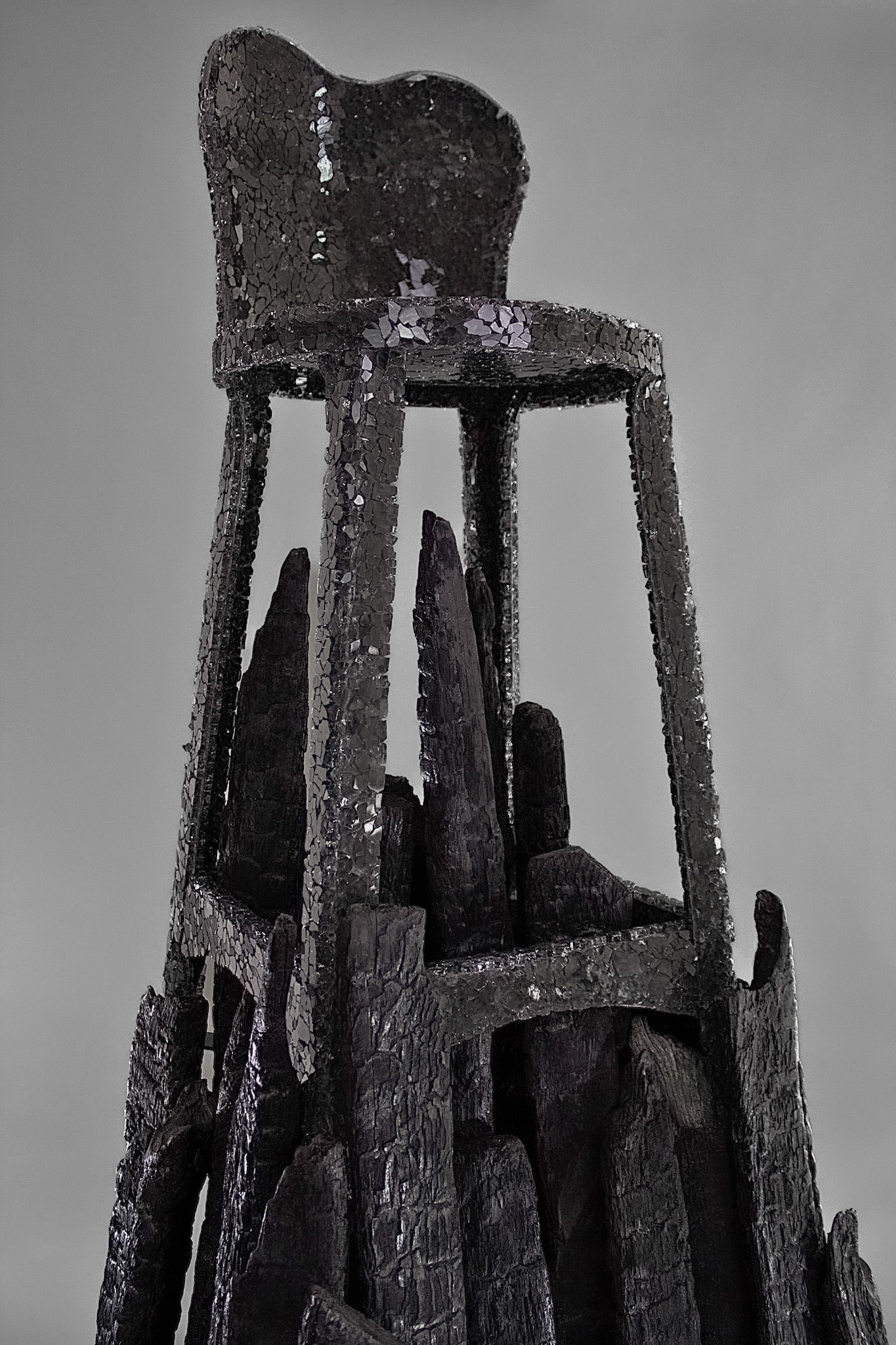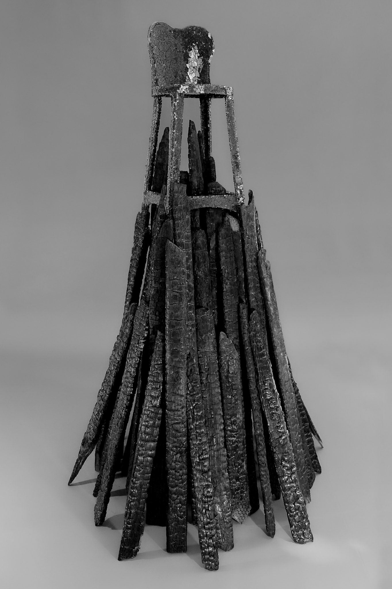 I used everyday materials rich in history: wood from my neighbor's burned home and an old steel chair. The chair is not special; in death, we are all equal. The smoked glass represents the vulnerable exterior we humans hold. While the chair's surface may seem beautiful, it can also be harmful. By covering it with glass, I illustrate an illusion of "specialness" and comment on human fragility.